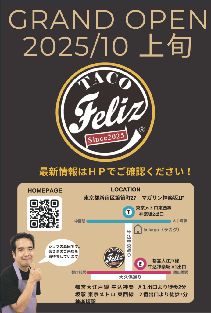 2025年10月、牛込神楽坂駅から徒歩2分の場所に新たにタコス専門店をオープンしました。